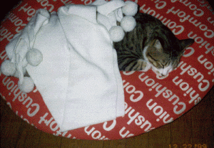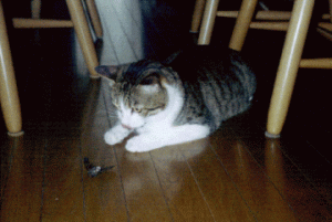 2000年1月2日 明けましておめでとうございます。コンピュータの2000年問題、何も無くて良かったね。でも、僕は2000年問題の被害者なんだ。猫缶を買い置きしてくれたのは良かったんだけど、間違えて僕の嫌いな缶詰だったんだ。いつもと味が違うので食べなかったら、ママさんが気がついて好きなご飯と替えてくれた。嫌いなのは肉系なんだ。近所の猫のうちにあげてもらったよ。 2000年1月16日 すっかりご無沙汰したけれど、僕は元気です。この頃は寒くてママさんの布団の中で寝ています。パパさんの布団では寝ないんだ。まだチビだった時、パパさんと一緒に寝てあやうくつぶされそうになってから、逃げることにしている。パパさんはママさんの倍ぐらい重いから。 2000年2月20日 パパさんが先週から風邪をひいていてあまり遊んでくれないのでつまんない。この間病院に行って猫白血病の予防注射をしてもらったのだけど、体重も計ってもらったら5.3kgもあって太り過ぎだって。 これ以上太るとまた病気が再発するよって言われてしまった。だからご飯の量が少し減らされたんだ。でも、またママさんたちに心配かけるといけないから、我慢しようと思うのだけど、お腹が空くとついご飯のお皿の前に行ってしまうんだ。普段は無口な猫なんだけど「ごはーん」って鳴いてるように聞こえるってママさんが笑ってた。 朝ご飯はパパさんが作ってくれるのだけど、やっぱり少しだけになっちゃった。僕の芸はね、ご飯の時パパさんが「待て」と言うと押すわりして待っていて、「よし」と言われるとご飯を食べるんだよ。すごいでしょ。ママさんの時は「Wait!」と「OK!」なんだ、僕、バイリンガル猫になったぞ! 2000年4月1日 今日はパパさんとふたり?で留守番です。みんなお茶会とかで出かけました。パパさんは午前中たくさんの本をケースにしまっていたので僕はそばで寝ていました。 午後は庭に出てパパさんは本を読んでいて、僕は木登りをしました。お隣の家にカラスが来たので追い払ってあげたらほめられちゃった。何か美味しそうなものをくれたので僕のかなと思ったら人間のおやつでした。残念。この頃また!また!また!太っちゃってお医者さんに怒られたんだ。体重が6kgを越えたらまた病気になるって。今?あまり教えたくないけど5.3kgです。まだ若いから食べ盛りなんだよね、いつも食べるか寝るかだって言われるけど、僕は猫だから仕方ないよね。 2000年4月19日 ついに体重が6kgを越えてしまった………。(*_*) それでダイエットを始めました。朝のご飯はいつもの4分の3です。お昼はドライフードだけ、おやつは無し、夕食もいつもの4分の3だって。それも、だんだん減らされるらしい。僕も一所懸命運動をしています。 夜にお腹が空いて眠れないよう。と思っていたら寝ていたらしい、パパさんが起きてパソコンの電源を入れている。僕はあわててパパさんの後から付いていって得意のすりすり攻撃だあ。パパさんニコニコして、いつもの4分の3だけご飯をくれた、なんだ知っていたか、残念。 |