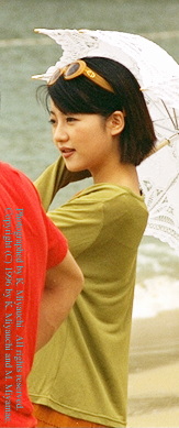| 最初の観光地、思い出の海岸に立つ真樹ちゃん。隣に居るコジローさんと何やら打ち合わせ中。手には売店で千円で買ったばかりの日傘。 | |