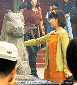 | 海岸にあった仏閣で馬の像をさわる真樹ちゃん。ファンはまだみんな緊張してて気安く近付けません。 | |
