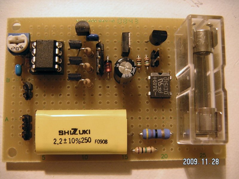 送られてきた試作品は AC アダプターからの DC 入力を前提としており、PIC への 5V はツェナーで生成している。消費電流は 40mA 前後なので今回は仕様を変更し、トランスレス電源を使って AC 100V 入力とした。LED 点灯用にはツェナーで 12V を、PIC は 3端子レギュレーターで 5V を生成させた。