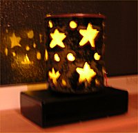 今回の製作に至った発端は、クリスマスに配偶者が LED キャンドル(ホームセンターとかで数百円で売ってるやつね)を買い求めたことであった。普段、管理人の製作物にはまったく興味を示さない配偶者が光モノに興味を示すとは点数を稼ぐ絶好のチャンス。速攻でプロトタイプ(写真参照)を作って配偶者の反応をうかがいつつ(汗)、発展型の製作を目論んでいたところ、都合よく笠間焼のキャンドルホルダーが手に入ったので、本格製作することに。
