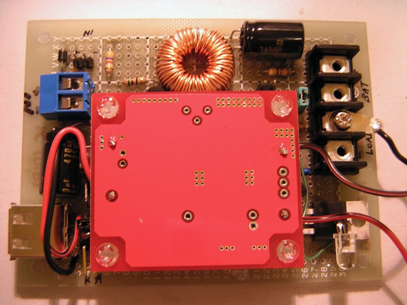 | USB コネクタや LED、子ガメ基板用 スペーサーを追加した改造 MPPT 充放電コントロール基板(表)。 |