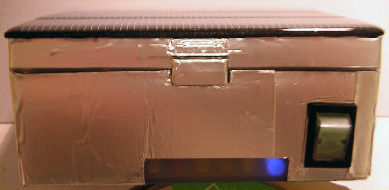 | アルミテープを貼り付けて 耐候性の向上を狙ってみた。 最下段には簡易電圧計を仕込んだ。 |