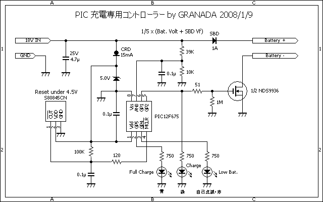 PIC は手持ちの潤沢な 12F675 を使用。まだポートが1つ余っているので、過放電防止機能を付けるといった改良も容易。