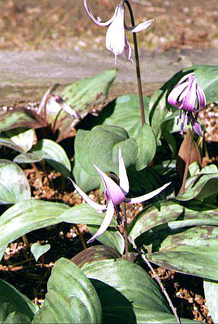 ゆり科。山地の湿った木陰に生える多年草で、春、紫に近い淡紅色の六弁花をつける。越中のような多雪地では時に大群落を見るという。