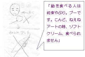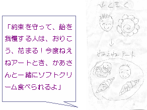 姉のアート教室が終わるのを待つ間、「ねえねがあとでおやつ食べるとき自分も欲しいと言わない」約束でソフトクリームを食べました。ところが、姉がおやつを買う段になったら、「飴ほしい飴ほしい飴ほしい!」と大騒ぎ。約束したことを言ってもほしいの一点張り。「今飴食べたら、もう今度から、ねえねアートのとき、ソフトクリーム食べに行かないよ、それでもいいなら飴食べなさい(怒)!」そうしたら、「うん」ととっても嬉しそうな顔で飴をとりに行くのです。その天真爛漫な笑顔を見て、「こりゃあ、わかってないぞ、ただ、飴食べていいんだと喜んでるだけ。また今度、姉を待つ間ソフトクリームを食べたいと騒ぐに決まっているなあ」