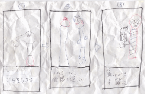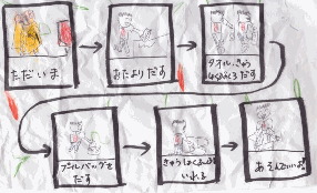 幸い、うちの子どもたちは、絵を描くのが大好き。枠だけつくっておいて、楽しい事よ〜というオーラを出しまくりながら、「スケジュールを絵に描いてくれない?絵、かあさんよりずっとうまいもんねえ」と提案。自分で描くのは面倒だなという手抜き母の思惑も知らず、嬉々として作りました。これです↓、