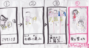 しばらくして「だまされた」と気づいたのか、子ども達のテンションは下がりスムーズではなくなったけれど、「食器運んで!」とか言い続けるより「1番は終わったねー」と言ってできる方が互いに気持ちが楽です。やらねばと観念しているけれどただ忘れてしまうという上の子は、もうシートなしでもだいじょうぶです。あんなに日々言い続けていたことが、あっけなくできてしまうんですね。