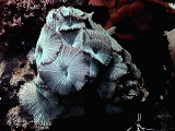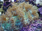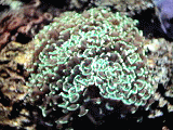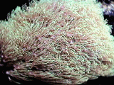 中心付近が蛍光色のグリーンで非常に奇麗なサンゴです。うちでは液体の餌を2〜3日に一度与えています。触手に毒があるせいか、隣り合わせに他の種類のサンゴを配置する時は注意が必用です。