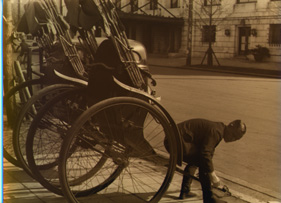 Comment : Rickshaw(Manual cars) in front of a hotel. The driver wore a pair of outer socks. This scene is just he is going to pick up a cap of bell like as a bicycle's.