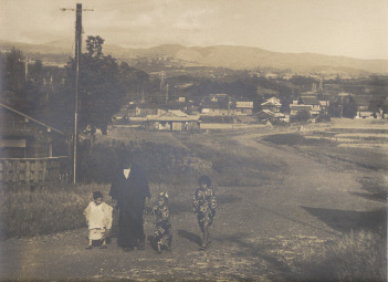 Comment : This is a typical photo presenting a family before the World War 2. The father wore black typical ware. And Children wore KIMONO. Here looks a fisherman's village. The road was not made of concrete.