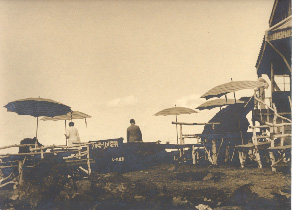 Comment : This scene is a typical style of rest. These parasols are indispensable. Man wore suits, and Woman wore white suits. This must be along a drive way, rope way or something.