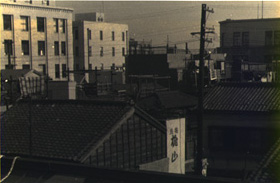 Comment : It is supposed that the War 2 has just ended. In contrast with western style buildings over, many Japanese style houses are standing still. You can see a panel written "Cafeteria MOMOYAMA" on the house. Japanese style houses are weak to a fire from a earthshake or a air raid. On the roof, there are stands to dry laundries.