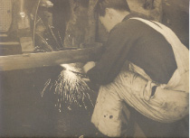 Comment : Owing to our scanner, this photo is not full size. In the original photo, the welder wore TABI socks and straw sandals. He didn't wear no mask and no safety shoes. they were expensive. OHMORI Tokyo is now the place where many works exist.