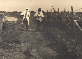 Comment : Housewives were wearing white cooking apron on KIMONO always, even on the way to shopping. And their bags were baskets. Sometimes they find edible plants on the way. It was a good time for them to make a rumor talk.