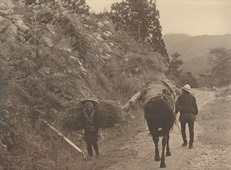 Comment : A woman is carrying a fagot of rush or something. She is waiting a horse and a man going away. A name of hot spring is written at the backside of photography. This shot should have been taken by Mr. Tashiro who had got off from this horse.