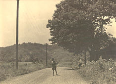 Comment : A little boy is carrying back his younger brother. Father is standing over there. In good old days, Father is a prestage existence. The disdance between boys and Father shows their relations.