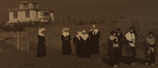 Comment : Here are nuns and Japanese women with Kimono. Japanese women wear black masks. The two parties must not be enemies. This should be after a funeral or after a mass which these Japanese women joined. This sand fields looks like a beach in Kanagawa prefecture, that were often taken by Yoshimitsu Tashiro.