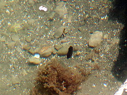 ハゼ1匹、アゴハゼかな?日向ぼっこをしているようにも見えます。この前まではオヤビッチャやシマスズメダイなどが泳いでいたところです。ハゼ1匹で寂しさを表現してみました。