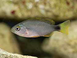 ネズスズメダイ、もう少しするとタイドプール(潮だまり)になってしまうという少し波の入る所にいました。背面のブルーが目立ちます。(全長:1.5cm)。ここの磯で見られたのは2007年から3回目なので稀な種になります。大きくなるとブルー色が消えていきますので、次の大潮時に元の場所に帰す予定です。