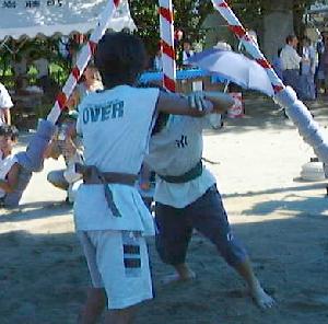 昼間の部の奉納相撲大会で、小学生以下の男女が学年別に戦います。