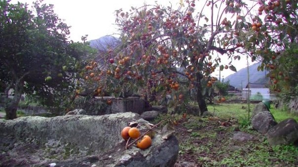 | 庭先の石の船と柿 背景は千燈岳と黒木山 |