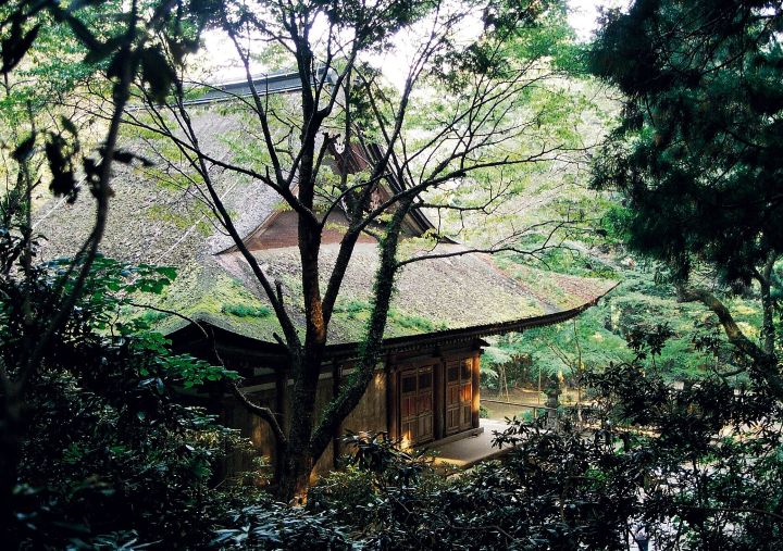 五重塔の石垣の端の石に腰かけて本堂を眺める。檜皮葺の屋根のところどころには苔と草が生えている。柱には秋の陽が射している。スケッチブックを出して本堂をスケッチした。