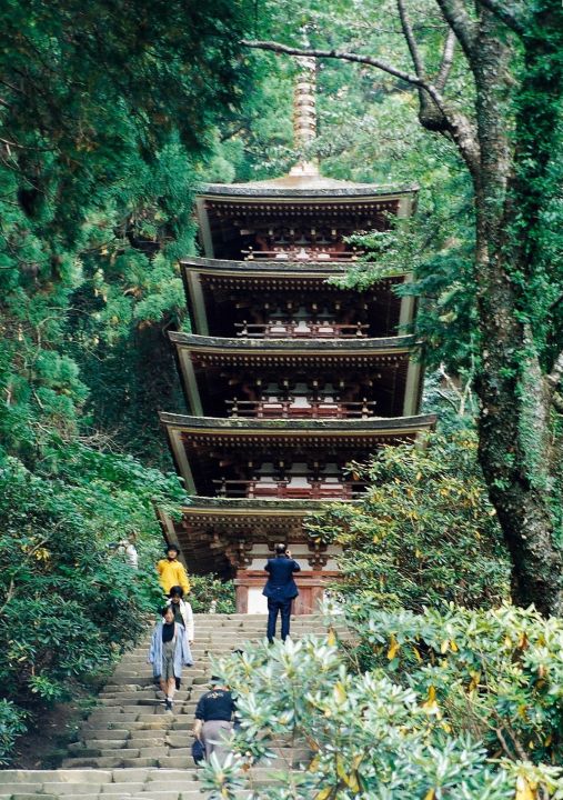 女人高野の象徴は杉木立を背景にあでやかに佇んでいる。山中で最も古く、天平時代に建てられた美しい塔だ。しばらく眺めて石段を登る。