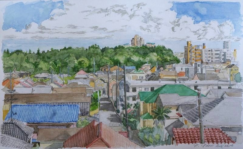 あまりに暑いので、野外でのスケッチをあきらめて、エアコンの効いた自宅の部屋から南の景色を描いてみた。机から長年見慣れた眺めだけれど、特に風光明媚というわけでもなく、家並みも複雑なので、これまで描く気になれなかった。雑木林の向うが中央林間で、遠く、雲の下あたりが江の島だ。