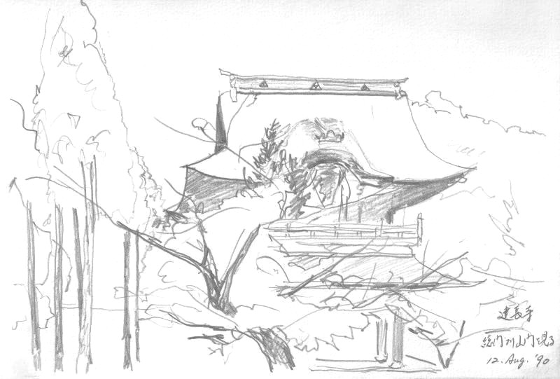 8月の鎌倉花火大会の日、円覚寺から建長寺へ。しばらく方丈で涼んだ後、山門をスケッチした。夕方からの花火にはまだ早いので、由比ガ浜へは源氏山をまわっていくことにした。