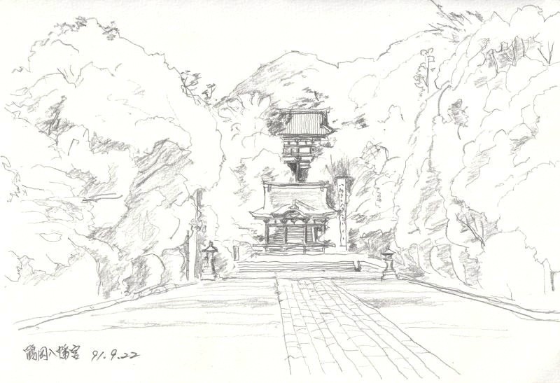 大船から横須賀線で鎌倉へ。八幡宮の三の鳥居をくぐったところにある石の太鼓橋を背にして本宮と舞殿を拝見する。本宮の後ろの山が左に切れ落ちているあたりに小林秀雄さんの旧居があったとのことだ。