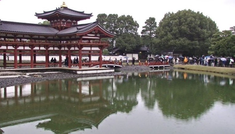 神戸に赴任していた1997年には夏と秋に2度訪ねた。そのときは阿字池は修復工事中で、大きく鳳凰堂を囲むような創建時の姿に復元されようとしていた。平成初めの発掘調査以前は、池の水は宇治川から引き入れていると思われていた。調査によって境内南側からの湧水が水源で、池は平等院創建当初から宇治川とは繋がっていない閉鎖水系だということが分かった。 池に水が満たされて、鳳凰堂はその上に浮かんでいる島のように見える。 次へ