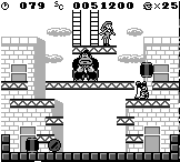 ただ、オリジナル発表当時は新鮮だった4ステージ構成も、10年以上経った時点では特に驚きも無く、いくらGBとはいえそのままの移植では誰も振り向かないだろう・・・という判断があったのかどうかは定かではありませんが、本作にはオリジナルには無かった要素がたくさん詰め込まれています。まず、オリジナルの4ステージの他に100近いステージが付け加えられています。これらは単にデザインが変わっているというだけでなく、新たな仕掛け (叩くとハシゴや床になるブロックなど) や敵が加えられ、またアクションだけでなくパズル要素を含んでいるモノも多数あります。特に、ステージの出口を開けるためのカギはスタート時には出口から遠い所にあり、これを拾い出口まで運ばなければならないのですが、カギを持ったままではハシゴを登ることが出来ません。そのためにカギを放り投げて移動させるのですが、マリオの手から離れたカギは一定時間が経つと元の場所に戻ってしまいます。放り投げる場所はもちろんのこと素早く移動しなければクリアすることは出来ません (ここらへんの難易度が絶妙)。ともすれば、適当にブロックを動かしたり、穴を掘ったりするというような仕掛けを付け加えるだけでパズルアクションと銘打っているゲームもありますが、このゲームの場合にはステージ上の仕掛けだけでなく、徘徊している敵の存在にも意味があり、これら全ての要素を考慮に入れてクリアするというホントの意味でのパズルアクションに仕上げているあたり、さすが任天堂といったところでしょうか。