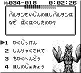 ただ、残念なのは問題の表示がトロイこと。普通のゲームだと、Aボタンを押すなりなんなりすると一気にメッセージが表示されるのですが、このゲームでは1文字ずつトロトロ表示されるだけで、一気に表示することが出来ません。しかも誤ってボタンを押してしまうと問題の表示が途中で止まってしまって回答モードに入ってしまいます。これは、お手軽さを身上とするGBにはちょっと不向きな仕様 (1ゲームに時間がかかる) だといえるでしょうね。