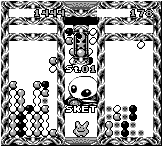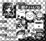 ただ、元々がカラーグラフィックを前提にしたマシン (MSXも一応カラーマシンですからね (^_^;)) で開発されたゲームだけに、GB版の場合ぷよの区別が非常に難しくなってしまっています。微妙にカタチを変えたりして工夫を凝らしてはいますが、GBの小さい画面ではその判別も難しく、ぷよの種類が少なく落下スピードも遅い最初のうちはまだ何とかなりますが、中盤以降はかなりキツイ戦いを強いられます。私が普段使ってるGBPでもそうですから、これがGBになるともっと大変だろうなぁということは容易に想像できますね。