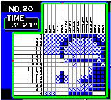 スリザーリンクはGBでは初登場ですが、WSでは既にリリースされています (自動問題生成機能付きのスグレモノ)。点と点を縦横に線で繋ぎ、全体で1つのループを作るのがこのパズルの目的。線をひく際、線は交差したり、枝分かれしたりしないのと、4つの点で囲まれた小さな四角の中の数字は、その四角の辺に引く線の数です (0なら辺は無く、3なら4つのうちの3つに線がひかれる)。Aボタンを押しながら十字キーを押すとその方向の辺に線がひかれ、Bボタンを押しながら十字キーを押すとその方向の辺の線が消されます。ちょっと面倒そうに思えますが実際に遊んでみると直感的に分かる操作系で非常にレスポンスが良いです。また、外辺の線を消すとインクが流れ込むように線 (黒の実線および緑の仮線) がひかれているところまでマスが青くなります。この青くなっているマスの内部には線がひかれないし、その周囲の辺の数によっては何処に線がひけるかが分かるようになります。ナカナカ素晴らしいアイディアですが、最初これを見た時はバグったか?!と思いました (だって、いきなり画面が青くなるんだもの (笑))。