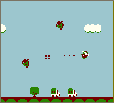 じゃ、このゲームがいわゆるク○ゲーかというとそうではありません。見た目はアレですが、なかなかシステムはシッカリしてます。操作は十字キーによる8方向移動、Aボタンによる機銃掃射、そしてBボタンによる宙返りです。被弾しても上を押しながらAボタンを連射すると回復するというのもユニークでしたが、やはり宙返りがこのゲームのキモです。敵の後ろに回り込んで攻撃したりとか、敵の基地を破壊するために地上にある爆弾を回収し宙返りで落とすことが出来ます。ここが重要!爆弾はステージの中ほどの位置に配置されています。基本的に爆弾を回収するまではやりたい放題です。しかし、一箪爆弾を回収してしまったら敵の基地上空にたどり着くまで宙返りは出来ません。被弾しただけで爆弾は落ちてしまうのに、宙返りによる回避が出来ない、それまでの敵との優位関係が一気に逆転してしまうのです。ここら辺のバランスは秀逸で正に手に汗握る展開といえるでしょう。
