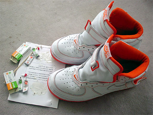 片方づつ革質が違うと言う件は稀に遭遇する事と言う事で話をヘニャヘニャ・アッパーを含めた話に戻すと、これらヘニャヘニャアッパーの場合履き込むと履き皺はつま先回りにまで及びシルエットはヨボヨボな状態となっていく場合が多いが、この対策としてスケートでのダウンヒルなどハードなライディング用にスニーカーを補強する手法が前出の余計な履き皺を軽減させる事に貢献する。しかし、扱う物と作業手段から素人にはお薦めできない。
