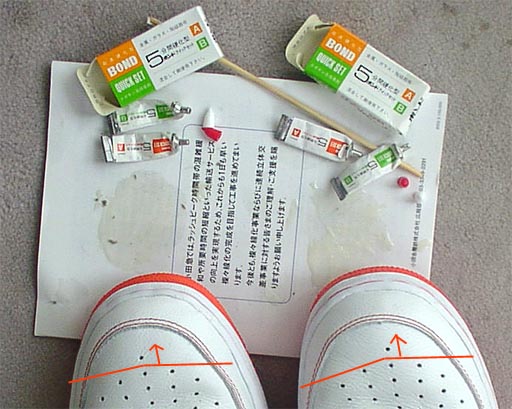 エポキシ系樹脂は主剤と硬化剤の2液に分かれており混合比率はタイプにより様々。今回使用しているタイプは扱いやすい1:1混合のタイプだがうまく混ぜ合わせられなかったり、比率を間違えるとちゃんと固まらなかったりするのは他のタイプと同様である為慎重に。 補強の構造としてはグラスファイバーとはガラス繊維の代わりに靴の裏の当て布を利用する点が違うだけで基本的には同じようなもの。もちろんガラス繊維やカーボン繊維を重ねて更に強靭な補強を行う事も可能。ただしこの場合中途半端な肉厚だと強い衝撃を受けた場合割れてしまい足に突き刺さる危険が伴うので注意が必要。 今回、補強する部分は画像の矢印から上の部分を補強する。型崩れ防止としては補強面積が少ないと思うかもしれないが違和感のない十分な屈曲を維持するには試履きを繰り返した結果このフォース1ではこの辺が限界と思われる。 さて、十分に混合したエポキシ樹脂を目的とする部分に流布するわけだが、ここが一番難しいポイントである。靴のつま先の中と言う見えない部分に流布する為、手探りで行うしかないので流布する位置を確かめる十分な練習が必要である。流布の仕方は人差し指に直接エポキシ樹脂を拭うようにとり目的の部分に塗っていく、塗る場合の厚みはアッパーに面した部分は生地のざらつきが残る程度にとどめ、ある程度柔軟性を残し、つま先の先端や切り返しの部分はまぁ、好みで適当にと言ったところか?厚く塗り過ぎると問題も出やすいので程々にとどめる。薄すぎの場合は後で重ね塗りすればいい。 |