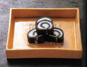 一、水前寺のりを水につけ戻す(約1〜2時間)。 豆腐はよく押して(元の重量の1/2)、よく摺り、 徐々に卵白、塩を入れる。 二、水前寺のりを広げ、乾いたふきんで水気を拭き、 豆腐を水前寺のりの倍位の厚さに塗り、巻く。 三、よく、蒸気の立った蒸し器に入れ、中火で12〜13分 蒸し上げる。 四、鍋にだし汁、塩、醤油、みりんを入れ、煮立たせ、三、を 入れ、5〜6分箸で転がしながら味付けする。 冷めてから小口切りにする。 |