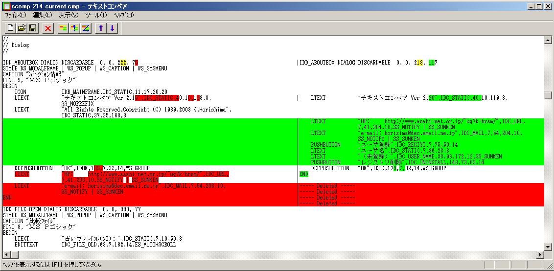 任意のファイル(ソースなど)やディレクトリを比較し、差分を左右に表示し、結果をテキストに保存できるテキストコンペアツールです。 比較対象となるファイルは、複数の拡張子指定が可能です。 Windows 2000 professional/XP Professional/Vista Business(32bit)用です。 変更歴 ・Ver 2.35 削除ファイルも比較する指定を支援しました。(削除フォルダーは未支援) ・Ver 2.35 行数の計算でEOFが含まれていたのを対策しました。 ・Ver 2.35 CMPファイルをDrag&Dropしたときに、ファイルが開かないのを対策しました。 ・Ver 2.36 Ver 2.35の修正でフォルダーのDrag&Dropができなくなっていたのを対策しました。 ・Ver 2.37 行の一致が続いていたときは、比較時に1行単位に比較するように改善しました。 ・Ver 2.37 行が一致していた後の追加・削除で比較が不正になるのを対策しました。 ・Ver 2.37 }の後の比較が不正になるのを対策しました。 ・Ver 2.37 空白行の比較が不正になるのを対策しました。 ・Ver 2.37 比較時の性能を改善しました。 ・Ver 2.37 readme.txtにWindows(R) Vistaの支援を追記 特徴 (1)文字コードをUnicode/JIS/Unicode(UTF-8)/EUC/SHIFT-JISの順に自動判別してテキストの比較ができます。 (2)比較結果を色分けして表示します。変更の場合は、1文字単位に結果を表示します。 (3)変更箇所へジャンプができます。また、サマリーでダブルクリックすると該当するソースの位置へジャンプできます。 (4)比較結果でダブルクリックすることで、ソースを表示します。(関連付けされているエディタを起動) (5)比較結果をテキストファイルとして保存できます。このとき、色分けを罫線に置き換えます。 また、変更が無い箇所が多い場合、途中を省略します。 (6)Drag&Dropで2つのファイルまたはディレクトリが簡単に比較できます。 (7)サブディレクトリのネストにも対応しています。 (8)比較するファイル・ディレクトリ、オプションなどを保存し、再利用することができます。 (9)変更、追加、削除行数(ステップ数)をカウントします。 (10)コメントのカウントができます。(/* */は未支援) (11)カラムずれや英字の大文字/小文字の差を無視して比較することができます。 (12)上限を指定してバイナリファイルを比較できます。 (13)フォントや色の変更・保存ができます。 (14)・ホイールマウスのホイールでスクロールできます。 送金について 本ソフトウェアは、シェアウェアですが、特に機能制限はしていません。 なお、本ソフトウェアを継続して使用する場合は、送金をしていただけますようお願いします。 送金については、ベクター・シェアレジサービスをご利用ください。 シェアレジ作品番号:SR034989 ベクター : http://www.vector.co.jp/ ライセンスキーの登録方法 ライセンスキーは、下記の手順で登録してください。 (1)「バージョン情報」画面の「ユーザ登録」ボタンをクリックしてください。 (2)表示されたダイアログのユーザ名欄に氏名、ライセンスキー欄にライセンスキーを入力してください。 (3)「OK」ボタンをクリックしてください。 (4)「バージョン情報」画面にユーザ名が登録されます。