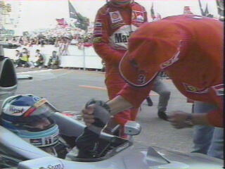 1998年F1第16戦日本グランプリの予選が11月1日(日)、鈴鹿サーキット(三重県鈴鹿市)で行われ、M.ハッキネン(マクラーレン・メルセデス)が優勝し、ワールドチャンピオン獲得を決めた。チャンピオンを争っていたM.シューマッハ(フェラーリ)はタイヤ・バーストで32周目にリタイアした。 天候は晴れ。チャンピオンを決定するのに相応しいコンディション。そのチャンピオンを争う2人ハッキネンとシューマッハが勝負を前にグリッド上で握手をするという、これまで見たことがない様なシーンが見られた。昨年のチャンピオン決定が曰く付きだっただけに、クリーンなレースを期待したいが。 さて注目のスタートで、信号が青になる瞬間にトゥルーリのエンストのためイエローフラッグが振られ、再スタートとなる。見ている方が緊張で胃が痛くなってきた・・・・ で、再度フォーメーションラップを終えて、再スタートのカウントダウンが始まろうかというところでなんとM.シューマッハがエンジンをストール。どうもミッションのトラブルのでエンジンが止まった模様。これで、シューマッハは最後尾スタートとなってしまった。 そして三度目の正直でようやくスタート。しかし、ハーバートがエンジンストールでスタートできず。先頭からのスタートとなったハッキネンは順当にトップをキープ。しかし、2番手クルサードは失敗して4位に。2位にはフェラーリのアーバイン。3位にフレンツェン。5位にヴィルヌーブ。以下、ヒル、ラルフ、ウルツ、フィジケラと続く。最後尾スタートのシューマッハは、1コーナーまでに5台を抜き、1周目には13位、2周目には10位にまでポジションをアップ。さらに、フィジケラ、ウルツのベネトン勢、弟のラルフを次々とパスして7位までアップ。しかし、6位のヒルはかつてチャンピオンを争ったライバル心からかそう簡単には前を譲らず、巧みにブロック。しかし14周目にヒルがピットインして前が空き、すぐさまヴィルヌーブをヘアピンの立ち上がりで抜き去って5位までアップする。 15周目にアーバインが、16周目にはシューマッハがピットイン。シューマッハは6秒台のピット作業でコースに復帰。18周目にハッキネンがピットストップ。2位アーバインが迫るがトップを守りコースに復帰する。その後フレンツェン、クルサードがピットストップしたため、とうとうシューマッハは3位まで浮上。前を行くのはチームメイトのアーバインとハッキネンだけとなる。ただ、シューマッハは見るからにギリギリの走りで、シケインでオーバーランするシーンが幾度とみられる。 トップを行くハッキネンは、トラブルはないようだが、後ろからアーバインがひたひたと忍び寄り、マクラーレンとフェラーリのマシンの差がほとんどないことが伺える。 28周目、アーバインが2回目のピットストップ。これも6秒台の短い作業で、もう一度ピットインが必要となりそう。 32周目、シケインで虎之介のインにトゥエロが飛び込んできて接触しお互いリタイア。虎之介は中指を立てて怒りをあらわにしていた。その直後、シューマッハがストレート後半で右後輪がバースト。これまでの無理な走りがたたったのか、さっきの虎之介らの接触の破片を拾ったのか。このリタイヤにより、M.ハッキネンの初のワールドチャンピオンが決定した。 40周目、中野がトラブルでS字の出口でマシンを止めてしまいリタイア。これで日本勢は全滅。 結局、ハッキネンがそのままトップでチェッカーを受け、チャンピオン決定戦を優勝で飾る。2位にはアーバイン、3位クルサード。4位にはファイナルラップのシケインでフレンツェンを逆転したヒルが入る。5位はそのフレンツェン、6位ヴィルヌーブとなった。 これで、コンストラクターズ・タイトルもマクラーレンが獲得。ブリヂストンは、参戦して2年目でチャンピオン・タイヤとなった。 |