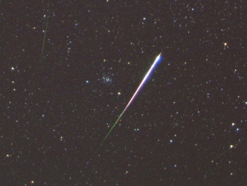 | 画像中央の星の集まりが、プレセペ星団。かに座の中心にある散開星団です。このそばを、下から上に、火球が流れました。色の変化は上と同じように見えます。 こちらも魚眼レンズをトリミングしています。かなり拡大しているので、少しぼんやりしましたが、火球の色は、よく分かります。 |