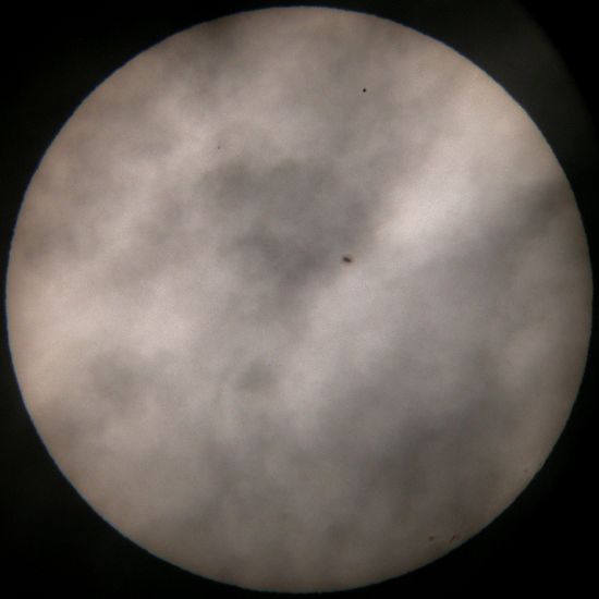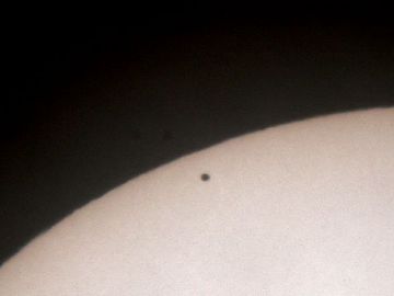 | 水星が、太陽面に入ってしばらくした様子です。丸い姿が印象的でした。 | 雲が多い中、だいぶ内側に入ってきました。まだらに見えるのは、雲があるためです。 | 太陽のふちが、変形しているのは、大気の流れのためです。 |