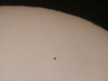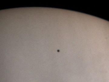 画像ではあまり立体感がありません。しかし、実際の姿は、明るい太陽面を通る真っ黒な水星が、丸みを帯びた感じに見えました。錯覚かもしれませんが、まさにボ−ル状の水星が通る感じでした。