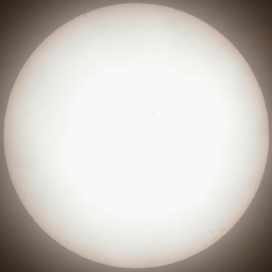 | 薄雲がかかった状態で、全体に白くなりました。また、露出もオ−バ−のため中心近くの黒点があまり見えていません。上の左側に水星が、真っ黒な点に見えています。 | こちらは、雲が多くなり、暗く見える部分が多くなりました。水星は右下に移動しています。中心付近の、黒点がよく分かり、下の右側も黒点、白斑が見えています。 |