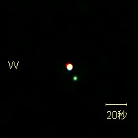 さそり座の頭部の3つの星のうち、一番北側の星がβ星です。主星は露出オ-バ-になり白っぽく見えますが、もう少し赤い星です。伴星は青緑色で、色の対比がたいへん美しいペアーです。小さな望遠鏡でもよく見えますので、ぜひご覧ください。