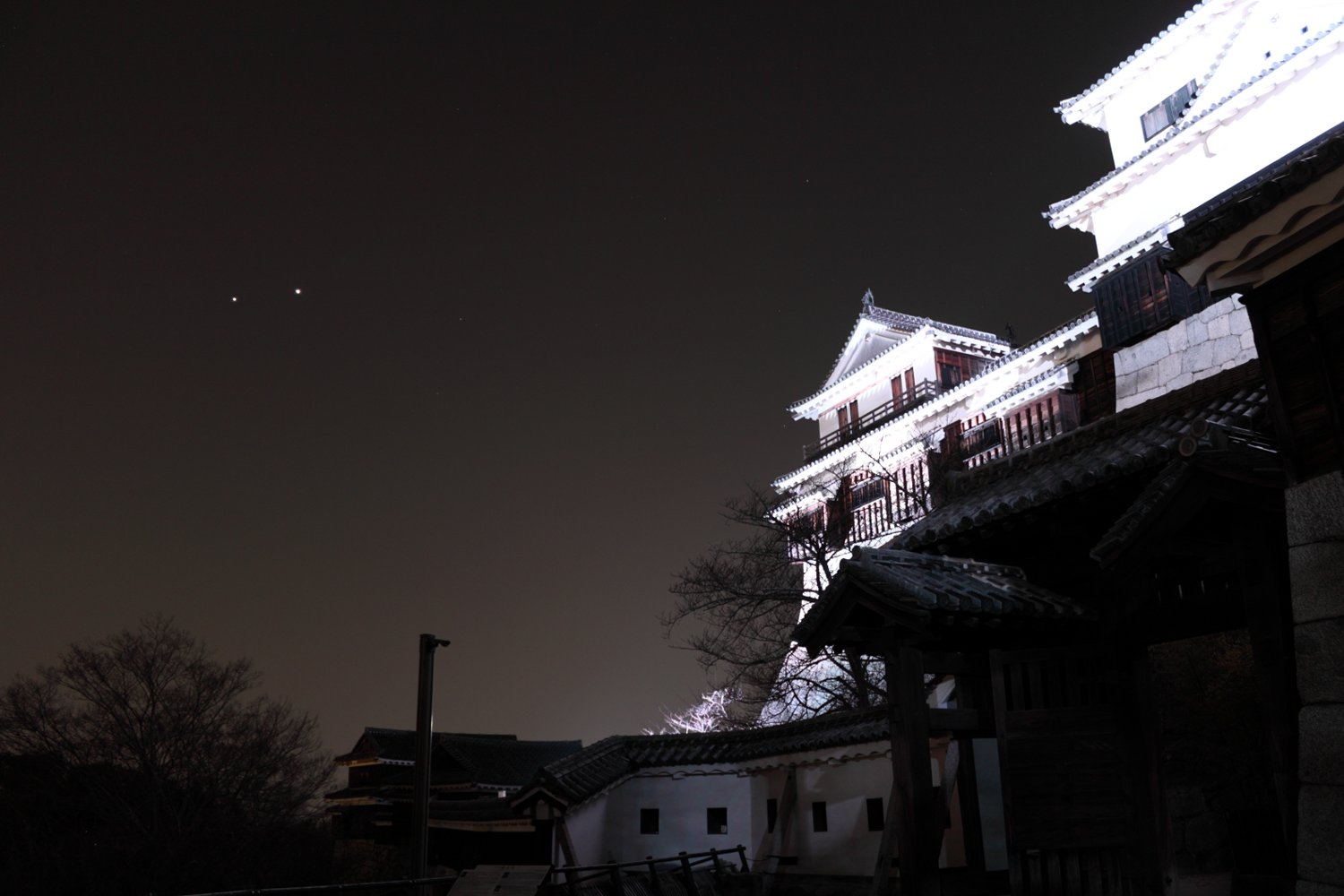 画像左の明るい星が木星と金星です。明るさは右側の金星が明るく、大きく写っています。右側が松山城ですが、ライトアップが明るく、少し明るすぎるようです。
