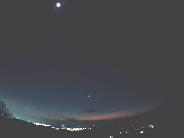 瀬戸内海に沈む太陽系の仲間 1999年2月22日 18時52分 オ−ト露出 松山市野外活動センタ−で撮影 カメラ:PENTAX MZ-10 17mmF4 フィルム:フジ センシア100 中心やや下に明るい金星と、木星が並んでいます。遙か上には、月、その下には、土星が見えます。そして、水平線ぎりぎりに水星が赤く光っています。これから、太陽系に仲間が海に沈んでいきます。