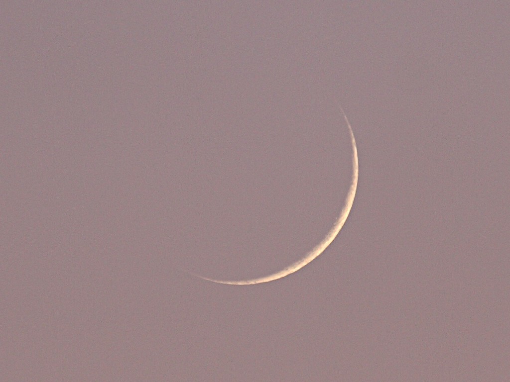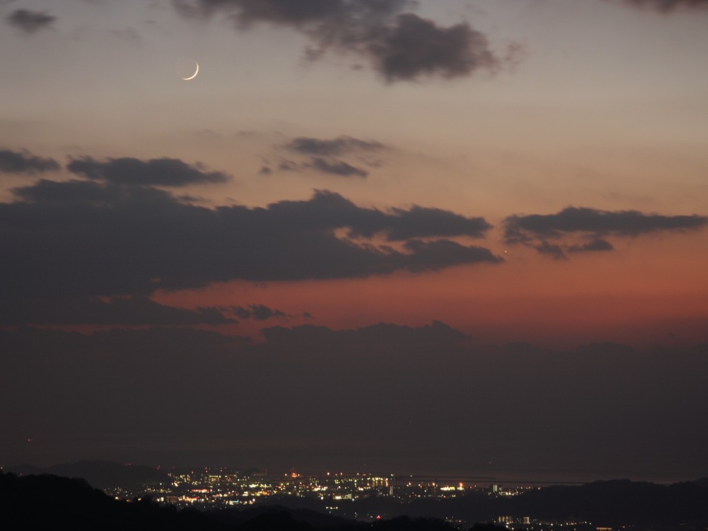 | 上の画像は、たいへん細い月の様子です。望遠レンズでの撮影なので、天体望遠鏡ほどシャープに写りませんが、なんとなくクレーターが分かります。細い月は、高度が低いので、なかなかきれいに撮影できません。下の画像は、中望遠レンズにして撮影しています。画像右よりの、雲間に見えるのが金星です。高度が低く、もやがあるのでそれほど明るく見えません。また、雲が多く、条件はあまりよくありませんでした。 |